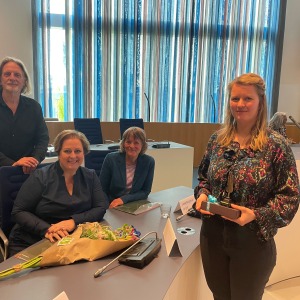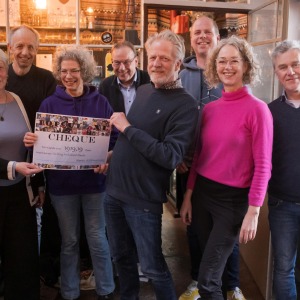 €1919,19, dat bedrag werd afgelopen december bij elkaar gespeeld door de deelnemers aan de PopQuizXL in Almelo. Zoals altijd komt deze opbrengst ten goede aan een goed doel. Dit jaar was dat Stichting De Vrolijkheid Almelo, een netwerk van kunstenaars, theatermakers en musici die zich inzetten voor kinderen, jongeren en hun ouders in asielzoekerscentra. Vorige week ontvingen vrijwilligers van deze stichting de cheque uit handen van Tom Weel, voorzitter van PopQuizXL.Beroemde Almelose Sporters als naamgever van vergaderruimtes