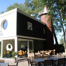 Volg de vuurtroren, die geleid je de haven in! Het pand was ooit bedoeld als woonboot voor de Almelose wateren, maar water heeft de boot nooit gezien. Gelukkig is er een nieuwe bestemming voor gevonden. De boot kreeg een mooi terras en een plek in het groen aan de Drienemansweg.